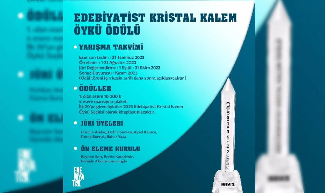 Edebiyatist Kristal Kalem Ödülü, bu yıl ikinci kez sahibini arıyor. Nitelikli edebiyata gönül veren yazar adaylarına destek olmak, çağdaş Türk edebiyatına yeni ve başarılı eserler katmak, iyi öyküleri ve öykücüleri gün yüzüne çıkarmayı amacıyla düzenlenen yarışmanın şartnamesi açıklandı.