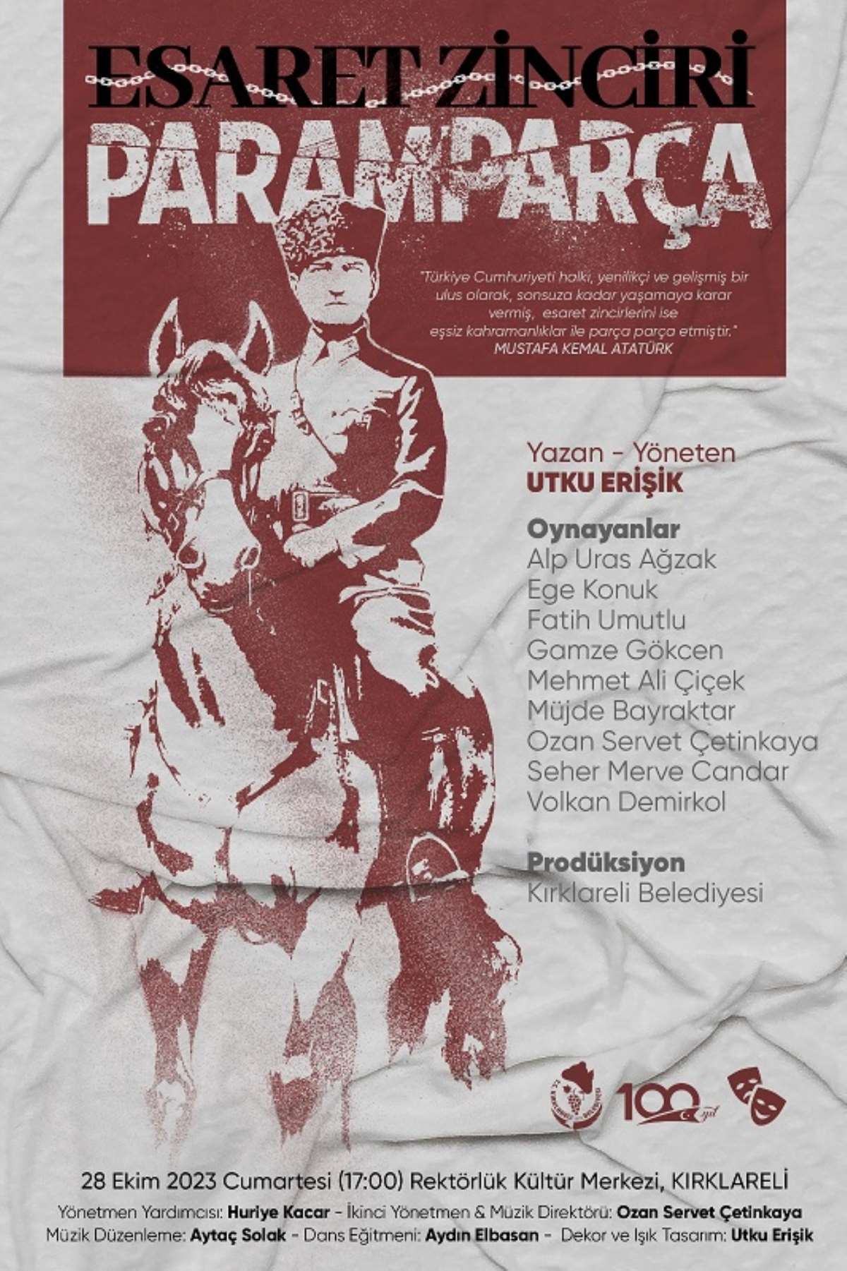 “Mudanya’dan Lozan’a, Lozan’dan cumhuriyetimizin ilanına uzanan çizgi, boynuna geçirilmek istenen esaret zincirini ulusumuzun nasıl paramparça ettiğini de adım adım gösteriyor. Kırklareli’nde yaşayan herkesin nabzının Mustafa Kemal diye attığını hep söyledik ve her zaman da söyleyeceğiz. İçimizde aydınlığa dair bir aşk, yüzümüzde umuda dair bir gülümseme varsa, bunu cumhuriyetimize ve Atatürk’ümüze borçluyuz. Belediyemizin prodüksiyonunu üstlenerek 100. yılda sanatseverlerle buluşturduğu ‘Esaret Zinciri Paramparça’, yurdumuzun dört bir yanını dolaşarak, Kırklarelilerin bu aşk ve umudunu gösterecek; nice yüreğe dokunacak.”
