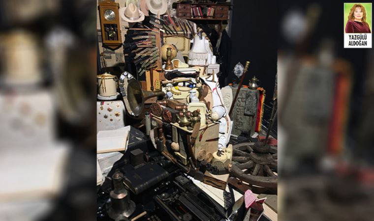Esere baktığınız zaman iki şey görebilirsiniz: sağdan soldan toplanmış eski püskü eşyalar, şapka devrimini anlatan şapkalar, bir kağnı tekerleği, bir kılıç, daktilo, ıvır kıvır! Ama geri çekilip bütüne baktığınız zaman onun masmavi gözlerini de görüyorsunuz, Atatürk’ü de seviyorsanız görürsünüz, bir avuç bedbaht gibi ona tepki duyuyorsanız işte o eşyaları görürsünüz sadece, Atatürk’ü anlayamadığınız gibi eseri de anlayamaz, duyamazsınız! Yıl sonuna kadar sergileniyor.