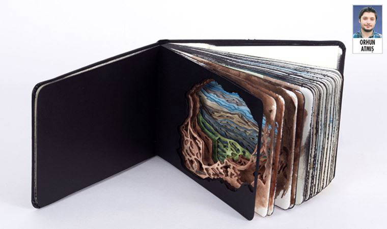 Sergideki tüm eserlerin ana malzemesi kâğıt. Hatta sergiye ilk adım attığınızda sizi kâğıtlar kesilerek hazırlanmış bir yazı karşılıyor: “Gümüşhane’de yasal izinle define kazısı yapılarak yok edilen “Dipsiz Göl...” 12 bin yıldır el değmemiş bir doğa harikası olan “Dipsiz Göl”ün yok edilmesi de sanatçıyı etkileyen konulardan. Her geçen gün yeni bir çevresel felaketin, doğal ya da kültürel bir değeri kaybetmenin acısını eserlerine ve sergiye yansıtıyor. Sergide bu yazının yanı sıra tablo olarak da Dipsiz Göl kendine yer buluyor.