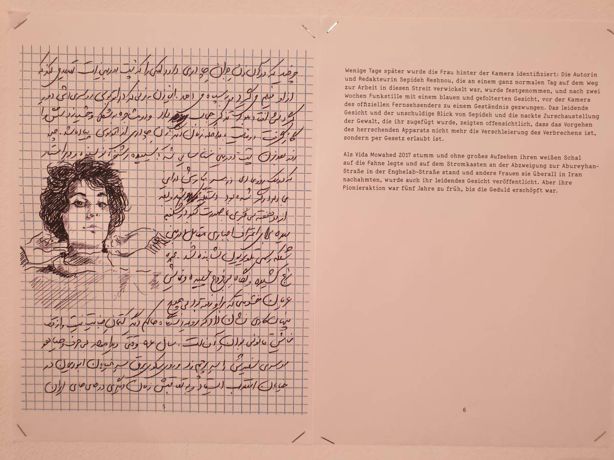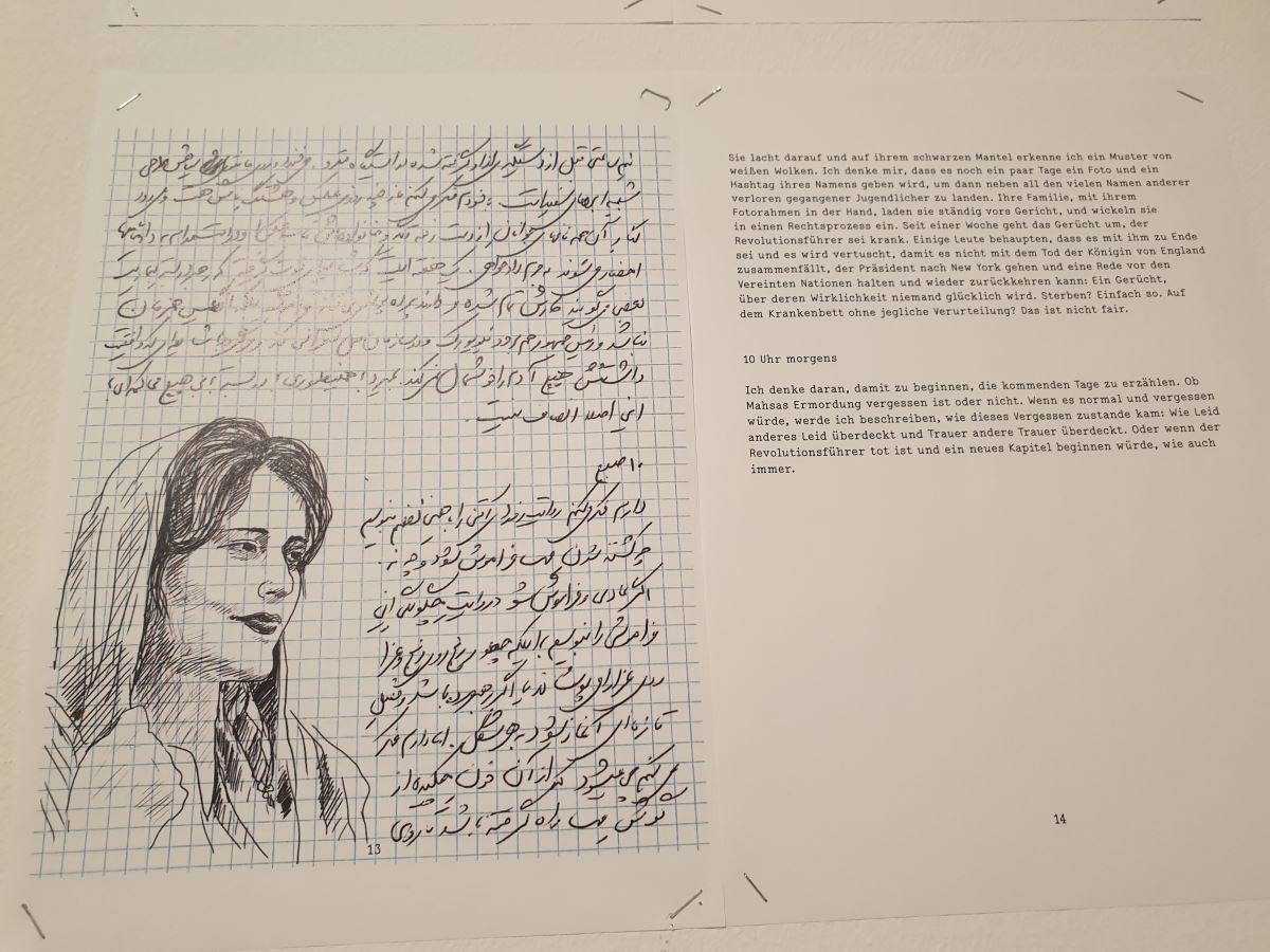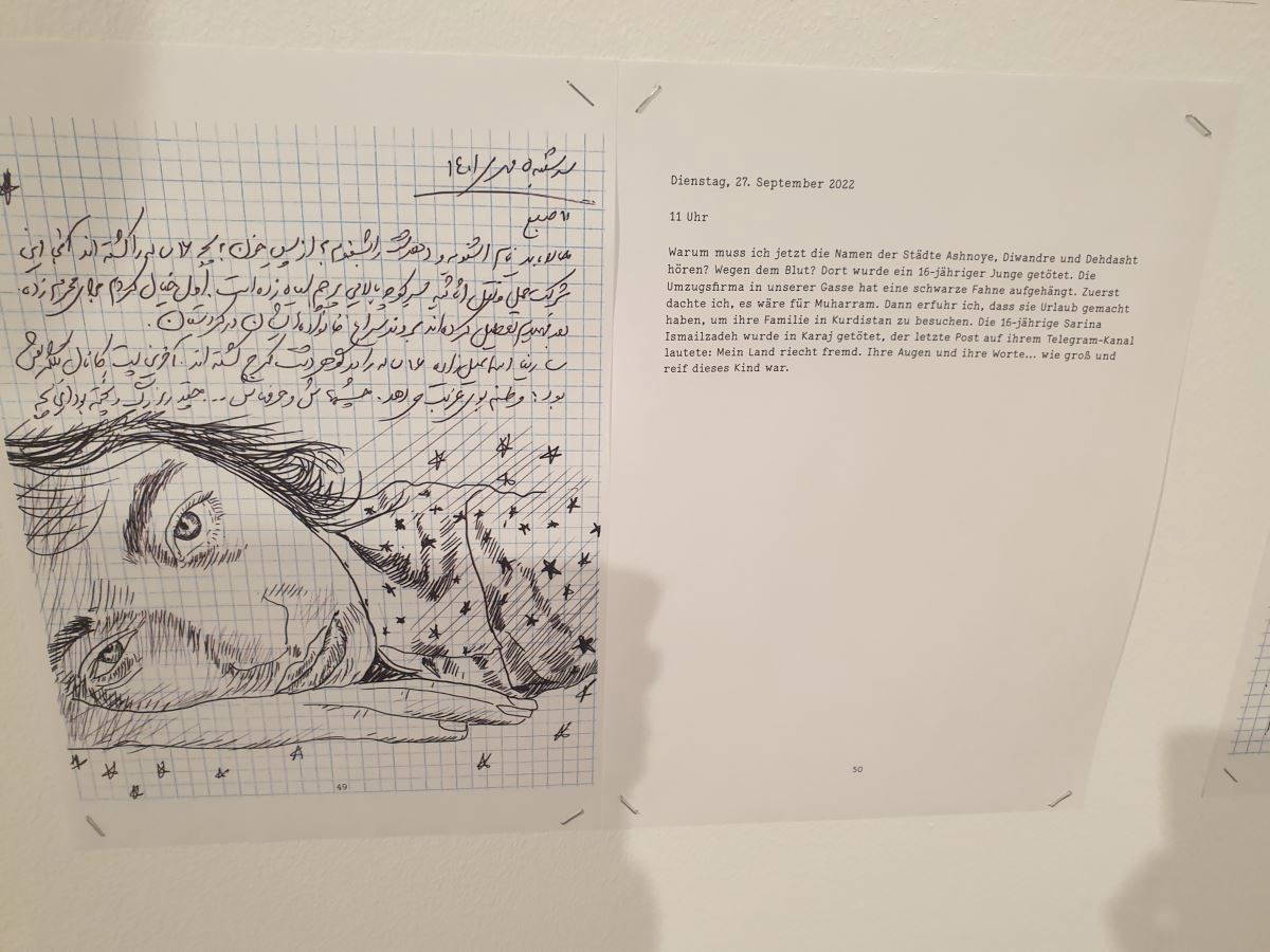 Serginin en çarpıcı yanı güncel çatışmalara ve savaşlara geniş çapta yer vermesi. Beni bu sergide en çok etkileyen ülkesinden kaçmış olan İranlı yazar ve sanatçı Jinoos Taghizadeh’in İran Günlüğü oldu. Tanıdıklarının, arkadaşlarının yaşadıklardan derlediği ve resimlendirdiği İran Günlüğünü okurken kendimi birden aylardır süren eylem hareketinin içinde buldum.
