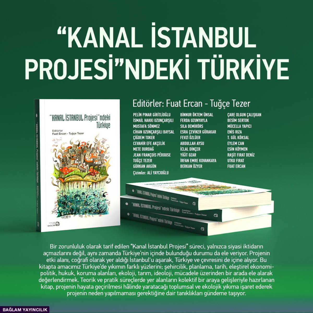 Kanal İstanbul Projesi” sürecini planlama gündemi, şehircilik, projenin yapılabilirliğine ilişkin eleştirel okuma, proje alanı ve çevresindeki köylerde yapılan saha araştırması, doğal eşikler, İstanbul’un kuzeyine yönelen mega projelerin gerçekleştirilme biçimleri gibi farklı açılardan ele alan ilk kısımda Pelin Pınar Giritlioğlu, Mustafa Sönmez, Cihan Uzunçarşılı Baysal, Çiğdem Toker, Cevahir Efe Akçelik, Mete Durdağ, Jean François Pérouse, Tuğçe Tezer yazılarıyla; Gu¨rkan Akgu¨n ise İstanbul’un değişen planlama gündemine dair söyleşisiyle yer aldı. Konuya eleştirel ekonomi-politik, hukuk, kentsel rant ve akıllı kentler açısından yaklaşan ikinci kısımdaki yazılar ise Ferda Uzunyayla, Sıla Demirörs, Esra Çeviker Gu¨rakar, Cihan Uzunçarşılı Baysal ve Fevzi Özlu¨er’e ait. Doğal yapı ve ekoloji, kır-kent ilişkisi, tarımsal üretim, kültürel miras ve farklı biçimleriyle yıkımları ele alan bir sonraki kısımda Abdullah Aysu, Yiğit Ozar ve İclal Dinçer, İrfan Emre Kovankaya ve Berkan Özyer, Çare Olgun Çalışkan, Besim Sertok çalışmalarıyla yer aldı.