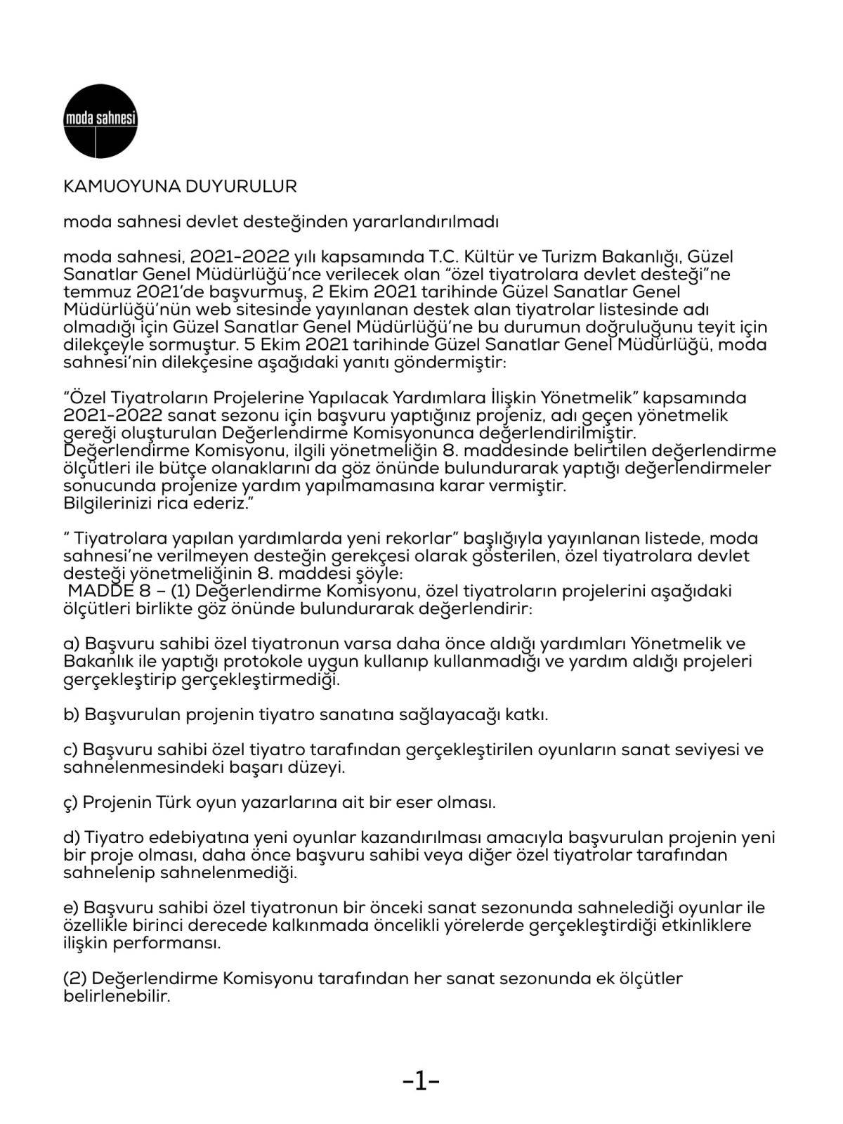 "Özel tiyatrolara verilen, rekor olmak bir yana enflasyon oranında artışı bile sağlayamamış bir bütçenin dağıtımında Kültür ve Turizm Bakanlığı’nın moda sahnesi’ni ayrımcılığa tabi tutmasını tabii ki kabul etmiyoruz. moda sahnesi’nin sanat üretimi konusundaki yeri bellidir. moda sahnesi sanatsal faaliyetlerini sürdürürken desteğe uygun görülen diğer tiyatrolardan herhangi bir eksiği yoktur. Bakanlığın değerlendirmesi bu nedenle keyfîdir. Bu desteğe uygun görülmememiz, men edilmemiz, moda sahnesi’nin sanatsal faaliyetlerini engellemek ve sansürlemekten başka bir anlam taşımamaktadır."