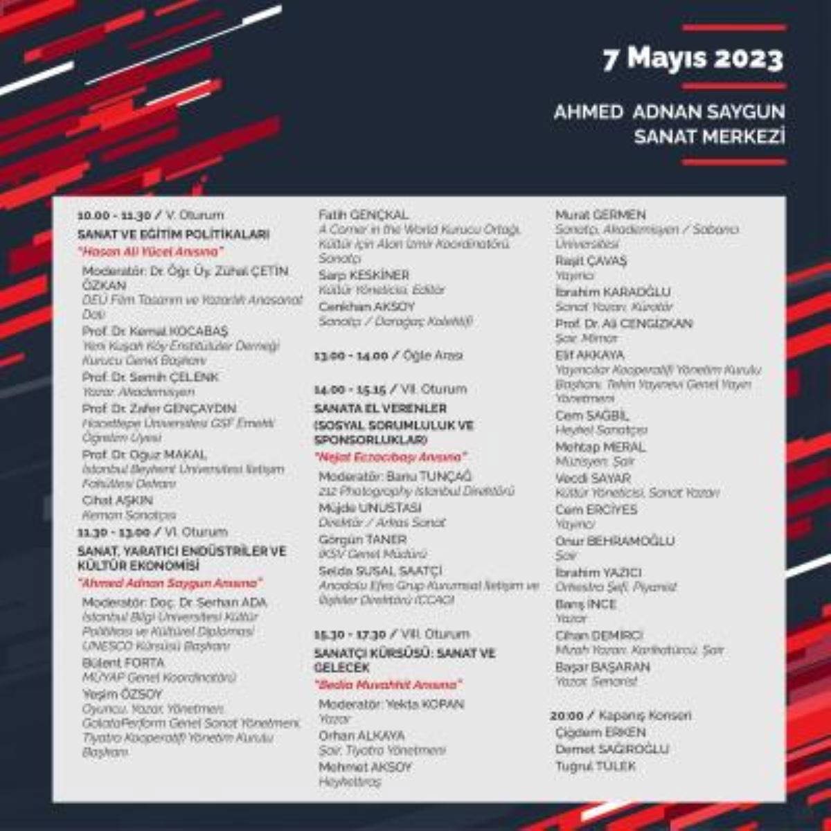 Cumhuriyetin İkinci Yüzyılına Girerken Kültür ve Sanatın Geleceği konulu sempozyumun ikinci günü ise saat 10.00’da “Sanat ve Eğitim Politikaları” oturumuyla başlayacak. Eski Milli Eğitim Bakanı Hasan Ali Yücel anısına düzenlenecek oturumun moderatörlüğünü akademisyen Dr. Öğretim Üyesi Zühal Çetin Özkan yapacak. Konuşmacılar ise Yeni Kuşak Köy Enstitülüler Derneği Kurucu Genel Başkanı Prof. Dr. Kemal Kocabaş, yazar- akademisyen Prof. Dr. Semih Çelenk, Hacettepe Üniversitesi GSF Emekli Öğretim Üyesi Prof. Dr. Zafer Gençaydın, İstanbul Beykent Üniversitesi İletişim Fakültesi Dekanı Prof. Dr. Oğuz Makal, keman sanatçısı Cihat Aşkın olacak. Saat 17.30’a kadar “Sanat, Yaratıcı Endüstriler ve Kültür Ekonomisi”, “Sanata El Verenler”, “Sanat ve Gelecek” konulu oturumlara ev sahipliği yapacak AASSM’de alanında uzman kişiler bir araya gelecek. Program ile ilgili detaylara kultursanat.izmir.bel.tr adresinden ulaşılabilir. Sempozyumun kapanış gününde ise saat 20.00’de Çiğdem Erken- Demet Sağıroğlu, Tuğrul Tülek konseri İzmirlilerle buluşacak.