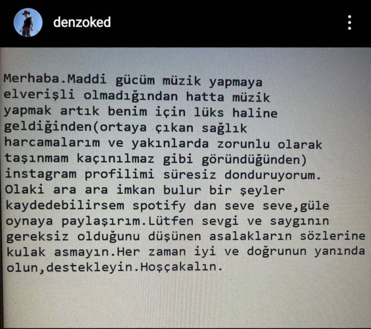 "Merhaba. Maddi gücüm müzik yapmaya elverişli olmadığından hatta müzik yapmak artık benim için lüks haline geldiğinden (ortaya çıkan sağlık harcamalarım ve yakınlarda zorunlu olarak taşınmam kaçınılmaz gibi göründüğünden) instagram profilimi süresiz donduruyorum. Ola ki ara ara imkan bulur bir şeyler kaydedebilirsem spotify'dan seve seve, güle oynaya paylaşırım. Lütfen sevgi ve saygının gereksiz olduğunu düşünen asalakların sözlerine kulak asmayın. Her zaman iyi ve doğrunun yanında olun, destekleyin. Hoşçakalın."