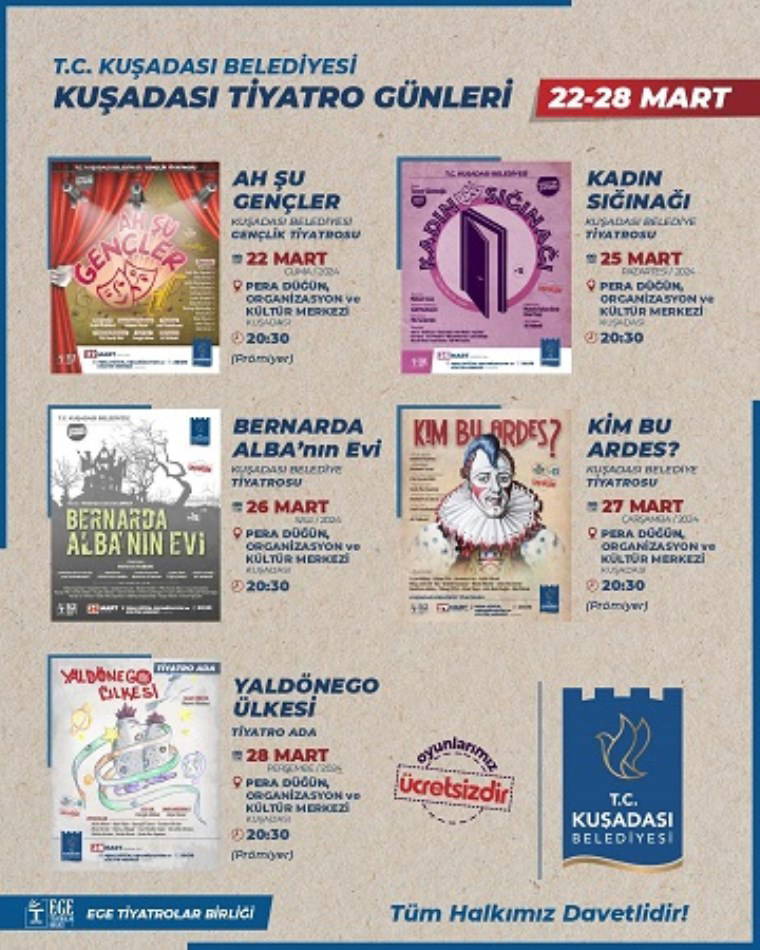 Aydın’da Kuşadası Belediye Tiyatrosu tarafından Dünya Tiyatro Günü etkinlikleri kapsamında düzenlenecek olan Kuşadası Tiyatro Günleri, 22 Mart Cuma günü ‘Ah Şu Gençler” isimli oyunla başlayacak. Kuşadası Belediyesi Gençlik Tiyatrosu oyuncuları tarafından sergilenecek olan oyunun ardından Kuşadası Belediye Tiyatrosu tarafından 25 Mart Pazartesi günü “Kadın Sığınağı”, 26 Mart Salı günü “Bernarda Alba’nın Evi”, 27 Mart Çarşamba günü “Kim Bu Ardes?” isimli oyunlar sahnelenecek.