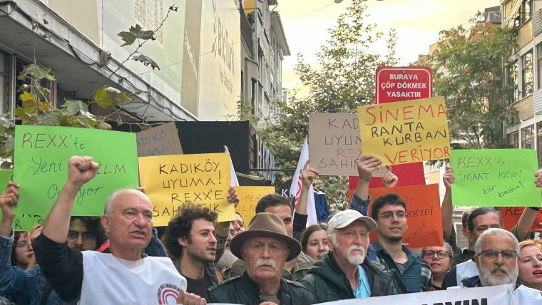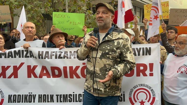 Nazım Hikmet Kültür Merkezindeki etkinliğin ardından THTM üyeleri, Kadıköy’de 60 yıldır Rexx sinemasına ev sahipliği yapan 200 yıllık tarihi binanın dönüştürülmesini protesto etmek için sinema önünde basın açıklaması yaptı.