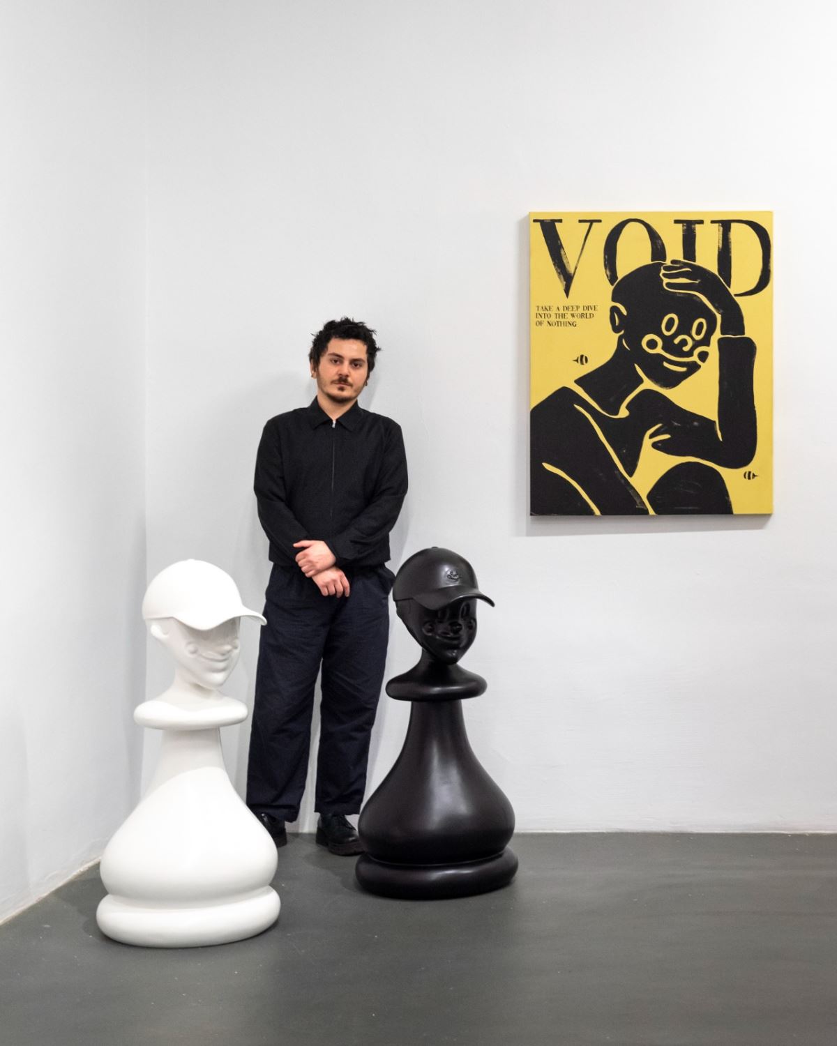 Melih Çebi’nin dünyası, tüketim toplumunun tatmin edici olmayan doğasını bebek figürleriyle izleyiciye sunuyor. Hızlı tempolu dünya, sürekli değişen eğilimler ve onlara ayak uydurma baskısı, sanatçının eserlerinde ön planda olan, hepsi birbirinin aynısıymış gibi görünen karakterlerine yansıyor. Sergideki karakterler, toplumsal normların ve beklentilerin bu yüzüyle alay ederken, mizah ve ironinin günümüz toplumunda yaşayan bir birey için mutluluğun anahtarı olduğu fikrini somutlaştırıyor.