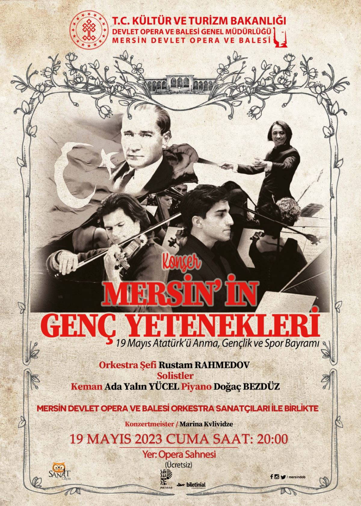 Mersin Devlet Opera ve Balesi (MDOB), 19 Mayıs Atatürk'ü Anma, Gençlik ve Spor Bayramı etkinlikleri kapsamında konser verecek. Konser, 19 Mayıs saat 20.00'de Mersin Kültür Merkezi Opera Sahnesi'nde ücretsiz olarak sahnelenecek. Rustam Rahmedov'un orkestra şefliğini yapacağı konserde, Ada Yalın Yücel ve Doğaç Bezdüz solist olarak sahne alacak. MDOB orkestrası ise eşlik edecek.