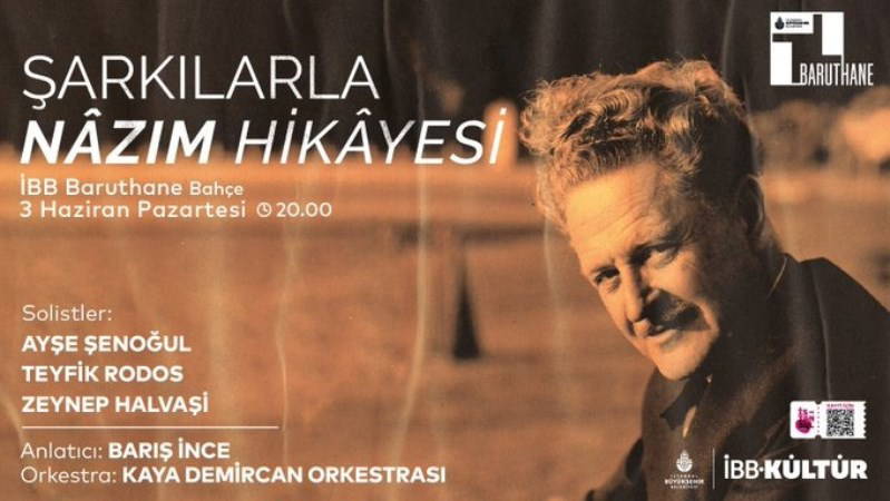 Türk şiirinin en büyük isimlerinden Nâzım Hikmet, Bakırköy'de bulunan Baruthane'de düzenlenecek "Şarkılarla Nâzım hikayesi" isimli etkinlikte, eserlerinden bestelenmiş şarkılarla anılacak.