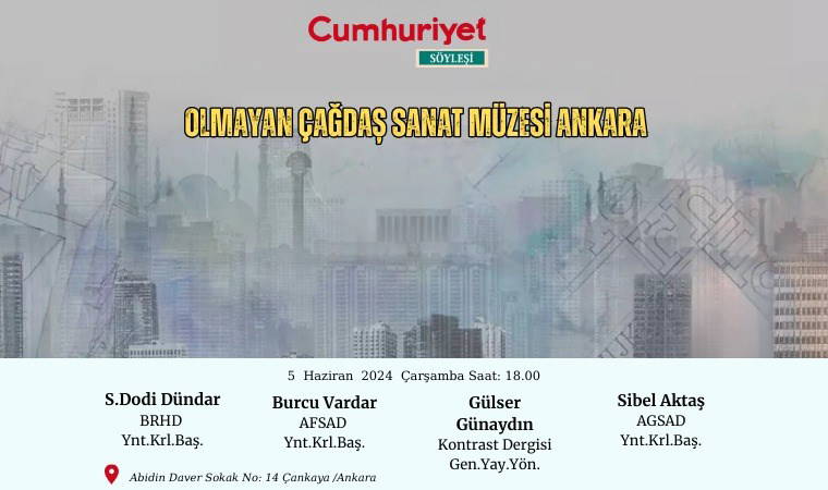 Gazetemiz Cumhuriyet’in Ankara Temsilciliği’nin sergi salonunda 5 Haziran Çarşamba günü saat 18.00’de “Olmayan Çağdaş Sanat Müzesi Ankara” söyleşisi düzenlenecek. Birleşmiş Ressamlar ve Heykeltıraşlar Derneği (BRHD) Başkanı Süleyman Dodi Dündar, Ankara Fotoğraf Sanatçıları Derneği Başkanı Burcu Vardar, Kontrast Dergisi Genel Yayın Yönetmeni Gülser Günaydın ve Anadolu Görsel Sanatlar Derneği Başkanı Sibel Aktaş’ın konuşmacı olarak yer alacağı etkinliğe ilişkin Süleyman Dodi Dündar şunları söyledi: