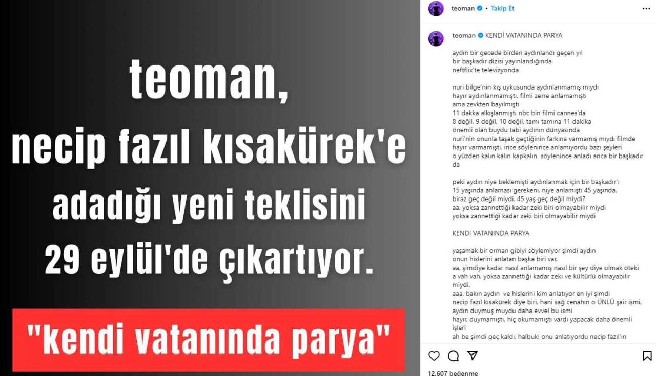 29 Eylül'de piyasaya süreceği yeni single'ını Necip Fazıl'a adadığını açıklayan Teoman, ünlü yönetmen Nuri Bilge Ceylan'a da atıflarda bulunduğu şarkıya dair paylaşımın altına şunları yazdı: