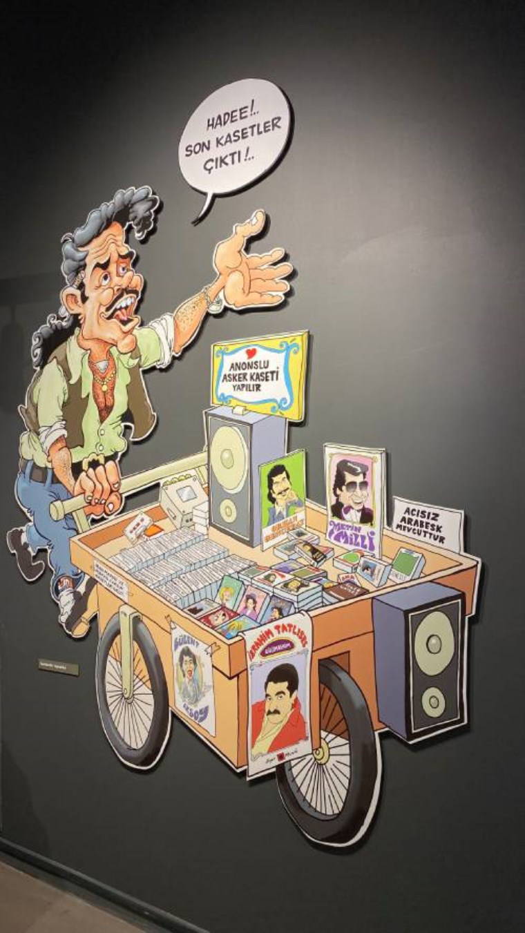 1923’ten başlayarak günümüze kadar uzanan müzik dergileri, gazetelerin müzik sayfaları, plaklar, kasetler, CD’ler, ve dönemle ilişkibihi her döneme damgasını vuran müzik çalarlar, albüm kapakları, müzisyenlerin oynadıkları filmlerin afişleri, içi kasetlerle dolu bir el arabası, özel bir nostalji köşesi... Sergide yok yok. Fikret Kızılok’un, 1969’da kendi parasıyla aldığı ilk gitar da sergileniyor; Musa Eroğlu, Muhlis Akarsu ve Yavuz Top’un sazla, sözle hemhal olduğu “Muhabbet 6” albümleriyle Tarkan’ın albümleri ve kart-postalları aynı camekân-da sergi-leniyor. Hem Zeki Müren hem Yahya Kemal hem de Ayna grubunun izine rastlayabiliyorsunuz. Kısacası her kuşağın kendi dönemine ait bir nostaljisi bu sergide yaşıyor.