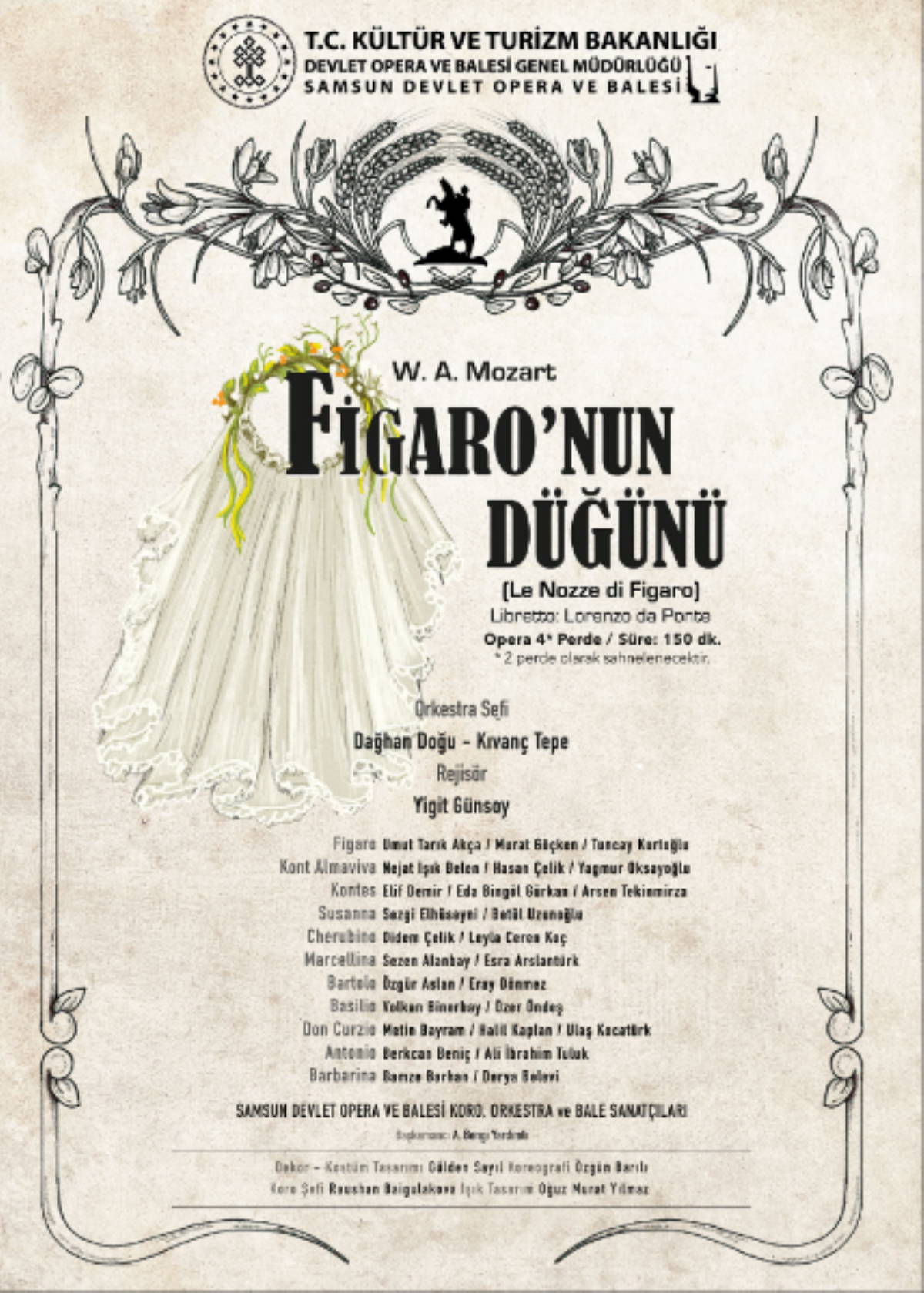 SAMDOB koro, orkestra ve bale sanatçılarının yer aldığı operanın rejisini Yiğit Günsoy, orkestra şefliğini Kıvanç Tepe üstleniyor. Eserin dekor ve kostüm tasarımı Gülden Sayıl, koreografisi Özgün Barılı, koro şefliği Raushan Baigulakova, ışık tasarımı Oğuz Murat Yılmaz'a ait. Eserin başkemancısı ise Bengi Yardımlı.