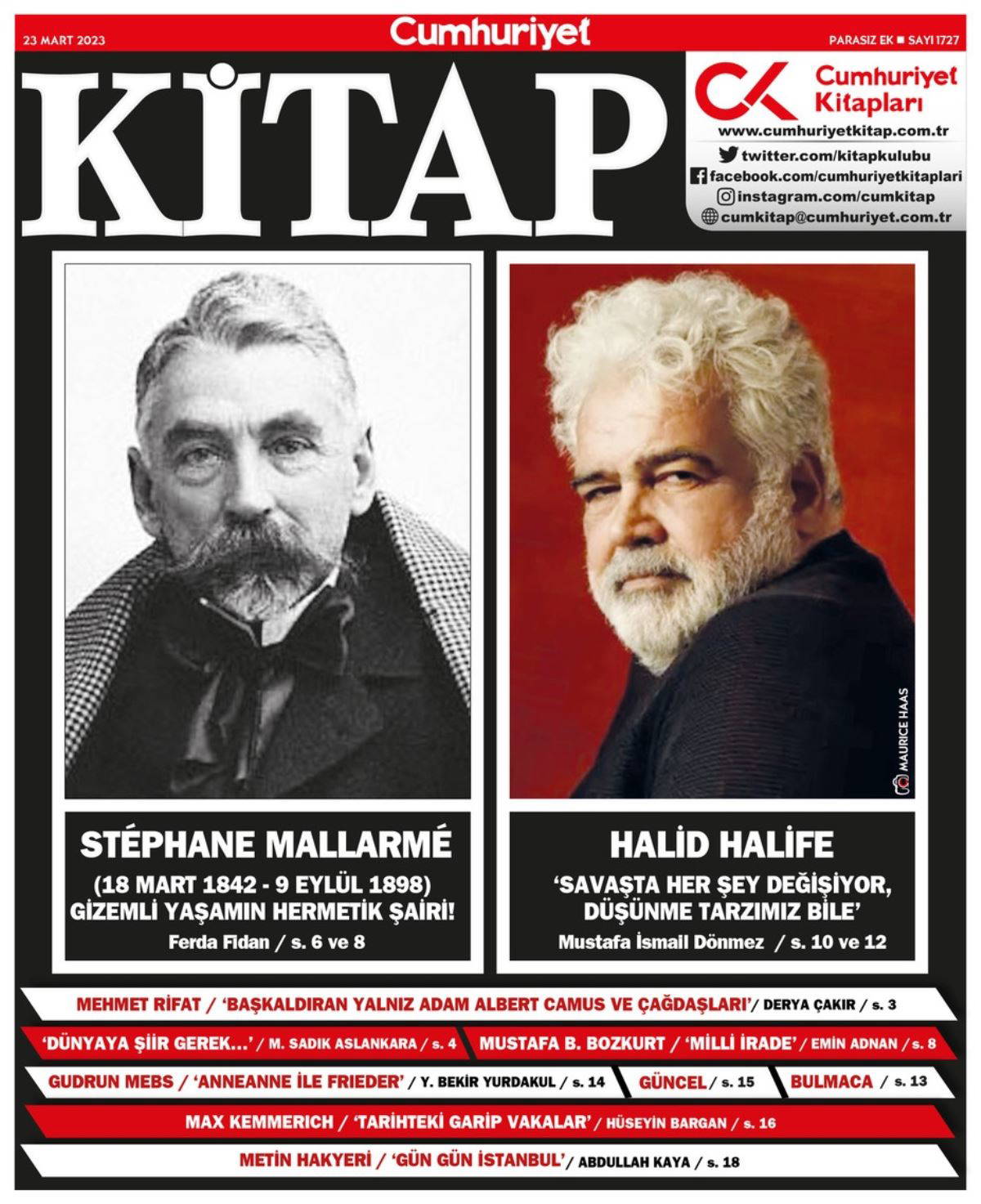 - Şiirlerinde gerçekliğin çirkinliğine vurgu yapan, şiiri ruhani bir macera olarak algılamış, sembolizm akımının kurucularından usta Fransız şair Stéphane Mallarmé (18 Mart 1842-9 Eylül 1898) ile romanlarında Suriye’deki rejimin politikalarını eleştiren, trajedileri, sosyal ve psikolojik yansımaları ele alan, bazı romanları yasaklanarak toplatılan, Suriye İç Savaşı’nı odağa aldığı Ölmek Zor İş (Çev. Mustafa İsmail Dönmez / Delidolu Yay.) ile çağdaş Suriyeli yazar Halid Halife kapağımızda. Ferda Fidan ve Mustafa İsmail Dönmez’in yazıları...