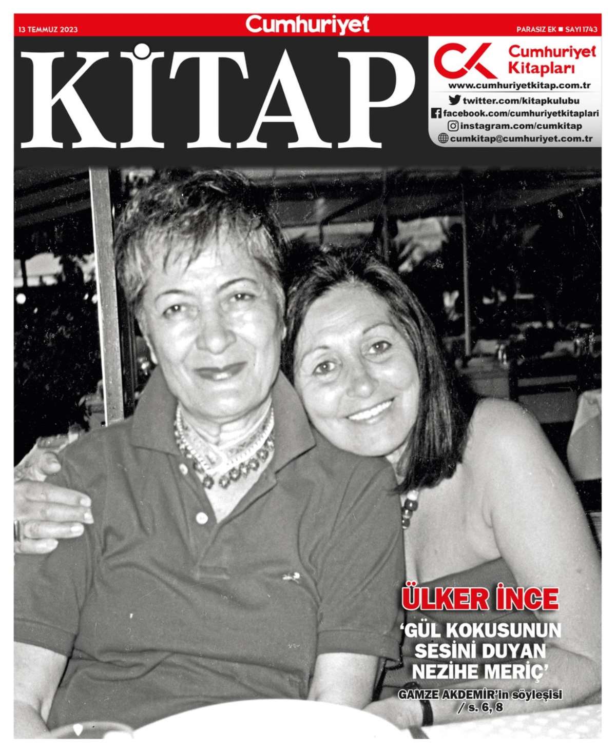 - Yakın dostu, ölümsüz yazarlarımızdan Nezihe Meriç’in anlatıcılığına içerden bir bakış sunduğu, “1950 Kuşağı”nın bu öncü kimliğinin anlatı evrenine, edebi dünyasına, yaratıcılığının kaynaklarına dönük okumalar için bir başlangıç kitabı olarak da nitelenebilecek monografik çalışması Gül Kokusunun Sesini Duyan Nezihe Meriç (Eksik Parça Yayınevi) ile usta yazar ve çevirmen Ülker İnce kapağımızda.