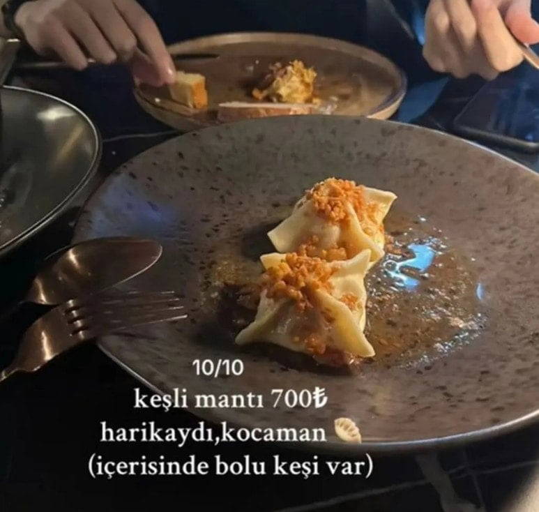 Sosyal medya paylaşımına göre, menüdeki keşli mantı porsiyonu 700 TL’ye sunuluyor. Bu tabağın içinde sadece iki büyük parça mantı yer alırken, en dikkat çeken yemeklerden biri de "Serseri" adıyla tanıtılan tabak oldu. Dana bonfile ve kalamarla hazırlanan bu özel yemek, 1550 TL’lik fiyatıyla kullanıcılar arasında büyük bir tartışma yarattı.