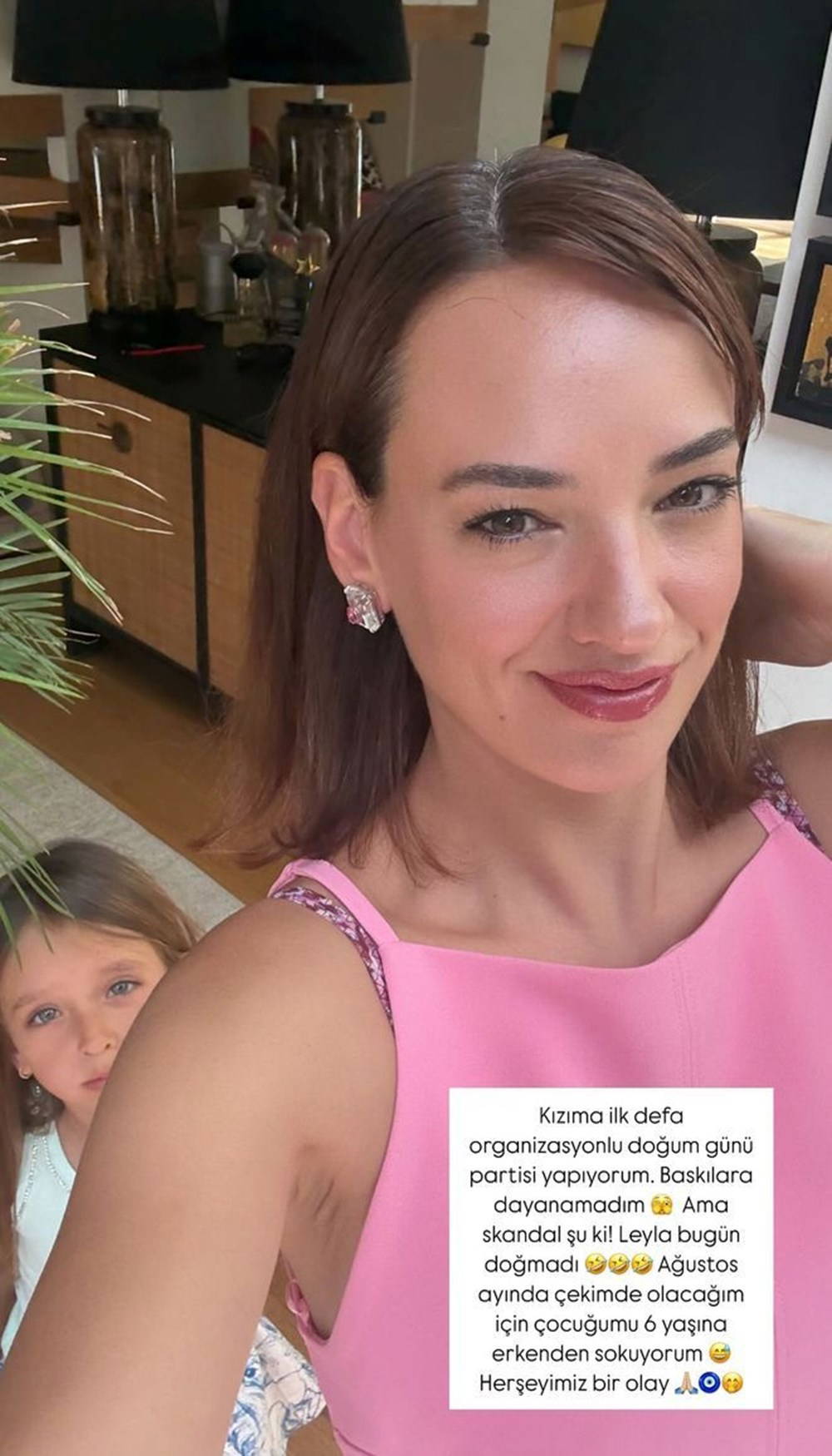 Ünlü oyuncu, büyük kızı Leyla için ilk kez organizasyonlu bir doğum günü partisi düzenlediğini duyurdu. Paylaşımında “Kızıma ilk defa organizasyonlu doğum günü partisi yapıyorum. Baskılara dayanamadım. Ama skandal şu ki! Leyla bugün doğmadı. Ağustos ayında çekimde olacağım için çocuğumu 6 yaşına erkenden sokuyorum. Her şeyimiz bir olay” ifadelerini kullandı.