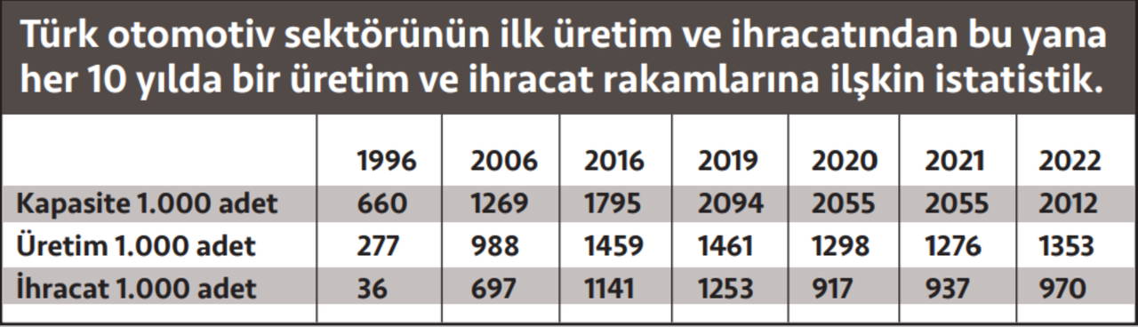 1996 yılından bu yana otomotiv sektörünün kapasitesinin üç kat arttığını vurgulayan Eroldu, şunları söyledi: “1996’da yürürlüğe giren Gümrük Birliği anlaşmasının otomotiv sanayinin dönüşümünde kritik rol oynadı. İhracat odaklı büyümeyle birlikte üretim kapasitesi ve üretim yıllar içinde katlanarak büyüdü. Günümüze geldiğimizde, Türkiye otomotiv sektörü dünya genelinde önemli bir oyuncu haline geldi. 2 milyon adedin üzerinde kurulu kapasiteye sahip Türk otomotiv sanayi, 1.35 milyon adetlik üretimiyle 2022 yılında motorlu araç üretiminde dünyada 13., Avrupa Birliği (AB) ülkeleri arasında dördüncü sırada yer aldı. Önemli bir ticari araç üretim üssü konumunda olan ülkemiz, 2022 yılında AB ülkeleri arasında ticari araç üretimiyle ilk sırada yer aldı.”