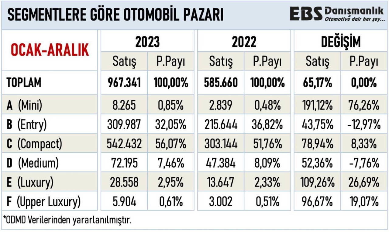 Türkiye'de 2023 yılında satılan otomobiller içinde en çok hangi segmentin seçildiği de ortaya çıktı. C segmenti yüzde 56.07 pay ile zirvede yer aldı. İşte segmentlere göre otomobil satışları...
