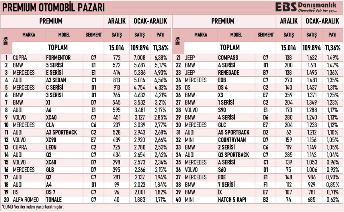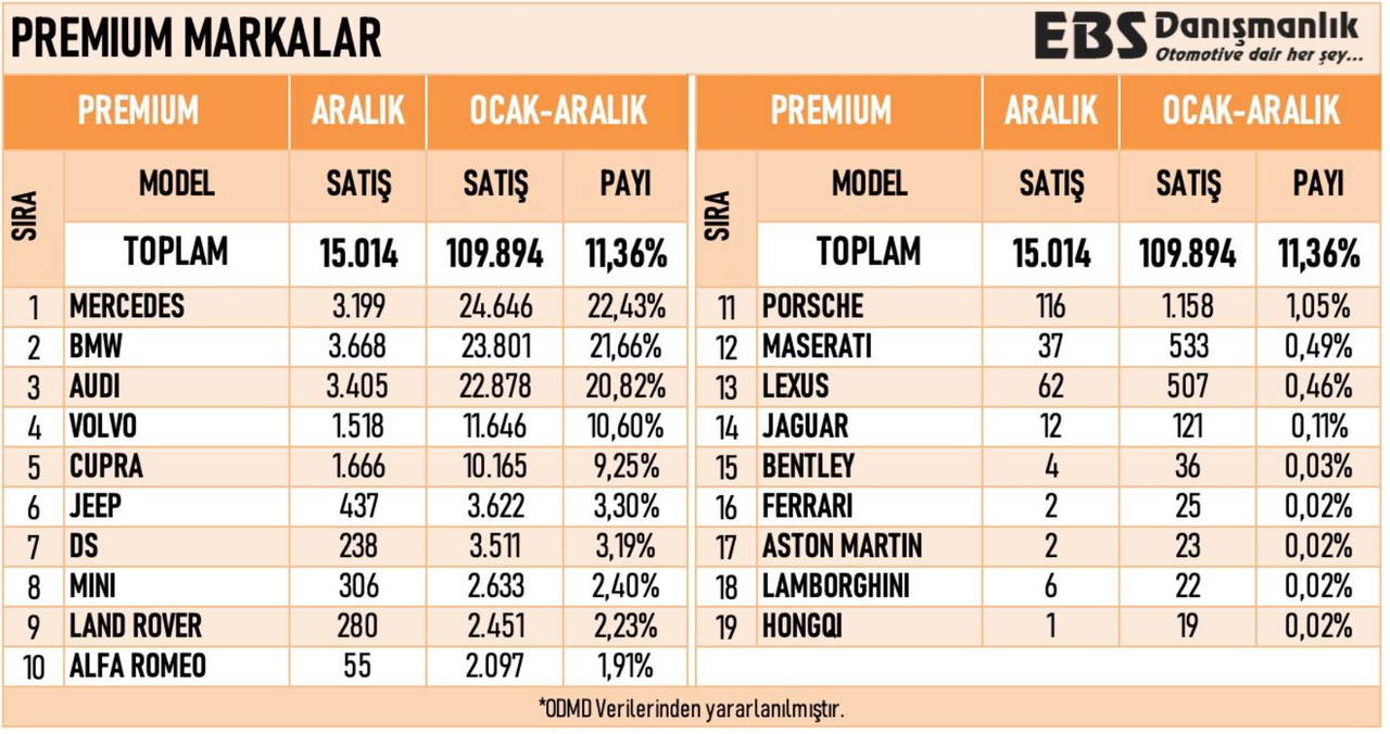 Lüks otomobil satışı 2023 yılında toplam satışın yüzde 11.36'sını oluşturdu. En çok satan lüks otomobil markaları ve en çok satan lüks otomobil modelleri paylaşıldı. Mercedes, BMW ve Audi'nin ilk üçü oluşturduğu görüldü.