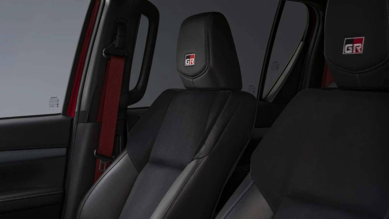 İç mekân, eski Hilux GR Sport'a göre biraz daha az renkli. Gösterge paneli boyunca uzanan kırmızı trim parçası artık yok ve koltuklar, kolçaklar ve el freni üzerindeki kırmızı dikişler ise gümüşe dönmüş. Ancak kırmızı emniyet kemerleri, GR markalı koltuklar ve alüminyum pedallar hâlâ mevcut.