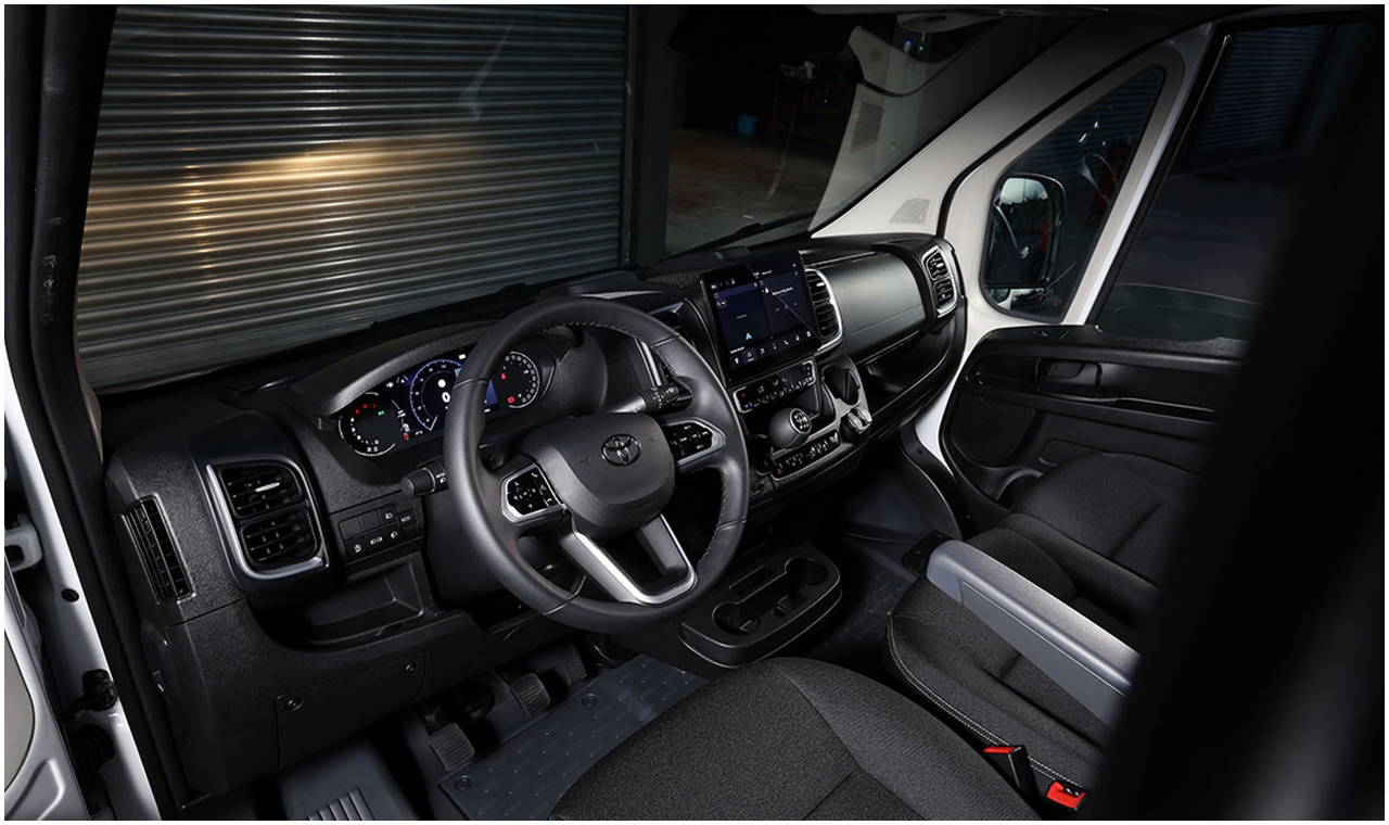 Proace Max'in kabini 3 kişilik oturma kapasitesine sahip ve 10 inç multimedya ekranı ve 7 inç dijital göstergelere göre şekillendirilmiş. Mobil ofis gibi kullanılabilen Proace Max modelinde, bir çalışma masasına dönüşebilen ön orta yolcu koltuğu ve ön konsolda ev tipi 230V priz de kullanıcıların iş hayatını kolaylaştırıyor.