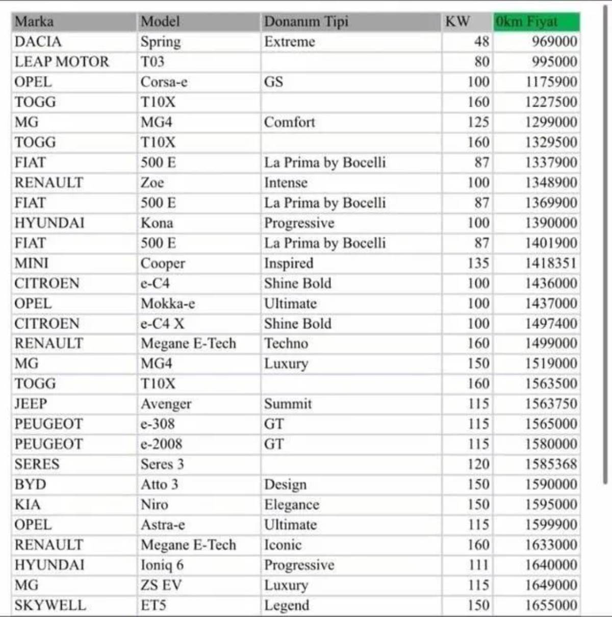 İşte yüzde 10 ÖTV alınan Türkiye'deki elektrikli modeller: