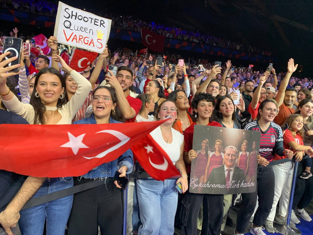 Salonda “Türkiye, Türkiye” sesleri yankılanıyordu. Her tarafta Türk bayrağı, Atatürklü tişörtler, Türkçe dövizler... Bir an kendimi Türkiye’de sandım. Milli takımımızın 7. oyuncusu olan seyirci muhteşemdi. Kocaman bez Atatürk fotoğrafını sırtına dolayan Nur Yılmaz ve Türk bayrağına dolanmış kardeşi Aynur Yılmaz Hollanda’dan Amsterdam’dan gelmişlerdi. Charleroi’dan gelen başörtülü iki genç kadının kucağında Türk bayrağı tişörtlü Zeyd Ömer minik kardeşiyle dikkat çekiyordu. Mert ta Barselona’dan gelmişti maça. İzmir’den gelen Kırmızıoğlu ailesinin 3 bireyi adına Ali Bey, “Laik, modern ve demokratik Türkiye’nin sembolü olduğu için sonuna kadar destekliyoruz kadınlarımızı” diye konuştu gururla. Bir levhaya “Sen ne güzelsin sultanım. Acı geçicidir, gurur sonsuza dek” yazıp yanına Vargas ve Ebrar adlarını ekleyen genç kadınımızı ve iki çocuğunu kayda geçmesem olmazdı. Bir genç kız elinde üzerinde Ebrar Karakurt fotoğrafı olan ve “Boş yapma Abdulhamid” yazan bir levha kaldırırken yanındaki genç de başka bir döviz ile yine Ebrar’a destek oluyordu. Belçika’nın Anvers kentinden gelen genç kızlarımızın tuttuğu ve “Ey kahraman Türk kadını” yazan Atatürklü fotoğrafı ise aslında her şeyi özetliyordu. Arkadaki iki kız çocuğunun kırmızı tişörtlerindeki Atatürk de dikkatli gözlerden kaçmıyordu.