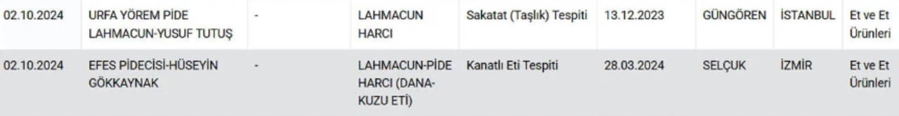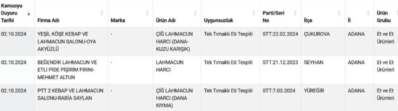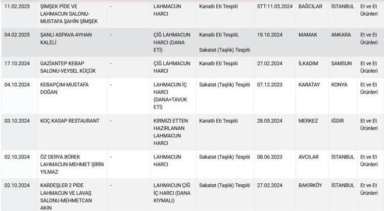 Söz konusu listelerde yer alan lahmacunlar ise şoke etti. Birçok lahmacunda "Tek Tırnaklı Eti" tespit edildi.