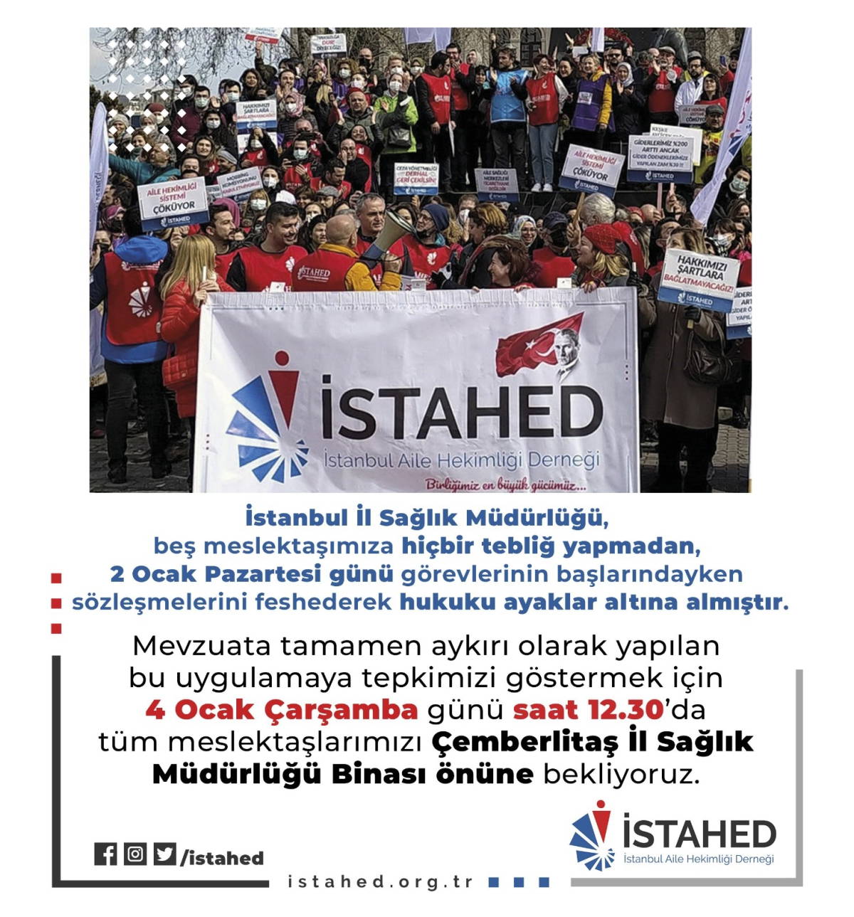 "İstanbul İl Sağlık Müdürlüğü, beş meslektaşımıza hiçbir tebliğ yapmadan, 2 Ocak Pazartesi günü görevlerinin başlarındayken sözleşmelerini feshederek hukuku ayaklar altına almıştır. Mevzuata tamamen aykırı olarak yapılan bu uygulamaya tepkimizi göstermek için 4 Ocak Çarşamba günü saat 12:30'da tüm meslektaşlarımızı Çemberlitaş İl Sağlık Müdürlüğü Binası önüne bekliyoruz."