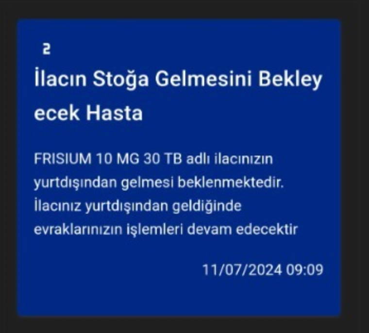 Konuya ilişkin Sağlık Bakanlığı’ndan Cumhuriyet’e yapılan açıklamada tedarik sorunu yaşandığını doğrulanarak, “Epilepsi hastalığının tedavisinde kullanılan clobazam etkin maddeli 2 farklı ilaç (Apo-Clobazam ve Frisium) yurt dışından tedarik edilen ilaçlar içerisinde yer almaktadır. Frisium ticari isimli ilacın globaldeki ruhsatının başka bir firmaya devredilmesi nedeniyle yaşanan, kısa süreli tedarik sorununun çözümü için çalışmalar Kurumumuz ve Türk Eczacıları Birliği (TEB) ile yürütülmektedir. Bu kapsamda TEB, Frisium ticari isimli ilacın siparişini yurt dışından vermiş olup firmasının beyanına göre, söz konusu ilacın 1 hafta içerisinde ülkemize gelmesi beklenmektedir. Hastalarımızın ilaca erişiminin kesintisiz devam edebilmesi amacıyla alternatif bir diğer ilaç olan Apo-Clobazam için de yine TEB tarafından gerekli sipariş oluşturulmuştur. İlgili ilaç en kısa sürede temin edilerek hastalarımıza ulaştırılacaktır” denildi.