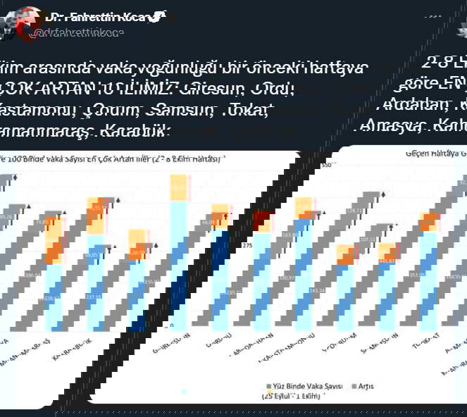 Sağlık Bakanı Koca, Twitter hesabından, 2-8 Ekim arasında illere göre her 100 bin kişide görülen Covid-19 vaka sayılarının güncellendiği haritayı paylaştı. Vaka sayısı en çok artan 10 il; Giresun, Ordu, Ardahan, Kastamonu, Çorum, Samsun, Tokat, Amasya, Kahramanmaraş ve Karabük oldu. Bu kentlerden 8'i Karadeniz Bölgesi'nde yer aldı.