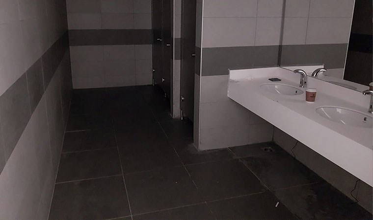 Hastanenin girişinde danışma alanı olarak ayrılan bölümde büyük bir masa bulunsa da danışılabilecek kimse yok. Otobüsün hastaları indirdiği yerden yapılan girişte B2 katı olarak geçen bu alanda büyük boş odalar var. Asansörlere gidilen alanda otomatik kapılar henüz takılmış değil. Yerler inşaat zamanından kalma tozlarla kaplı. Personel yetersizliğinden tuvaletler oldukça pis.