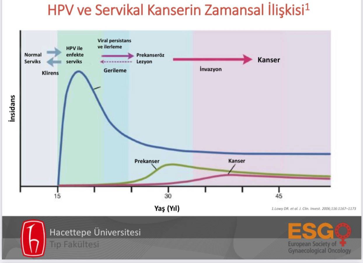 Sağlık Bakanlığı Halk Sağlığı Genel Müdürlüğü’nün sitesinde hâlâ bulunan “HPV Aşıları” adlı sunumda “HPV ve Servikal Kanserin Zamansal İlişkisi” grafiğinde, HPV enfeksiyonun 18 yaşında zaten pik yaptığı görülüyor.