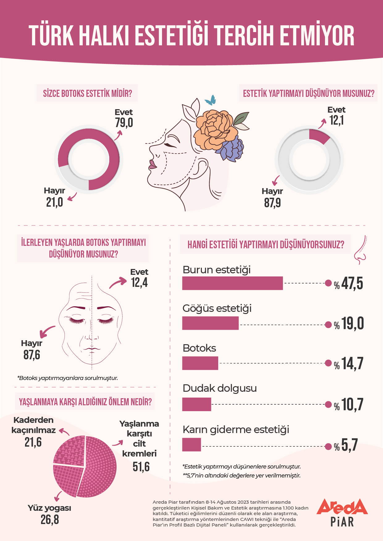 Areda Piar tarafından 8-14 Ağustos tarihleri arasında gerçekleştirilen Estetik araştırmasına bin 100 kadın katıldı. Tüketici eğilimlerini düzenli olarak ele alan araştırma, kantitatif araştırma yöntemlerinden CAWI tekniği ile 'Areda Piar'ın Profil Bazlı Dijital Paneli' kullanılarak gerçekleştirildi.