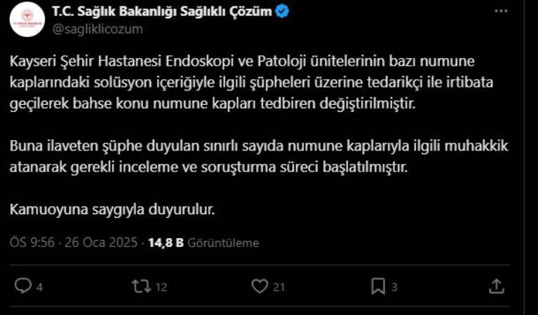 Bakanlığın sosyal medya hesabından yapılan açıklamada, "Kayseri Şehir Hastanesi Endoskopi ve Patoloji ünitelerinin bazı numune kaplarındaki solüsyon içeriğiyle ilgili şüpheleri üzerine tedarikçi ile irtibata geçilerek bahse konu numune kapları tedbiren değiştirilmiştir. Buna ilaveten şüphe duyulan sınırlı sayıda numune kaplarıyla ilgili muhakkik atanarak gerekli inceleme ve soruşturma süreci başlatılmıştır. Kamuoyuna saygıyla duyurulur" denildi.