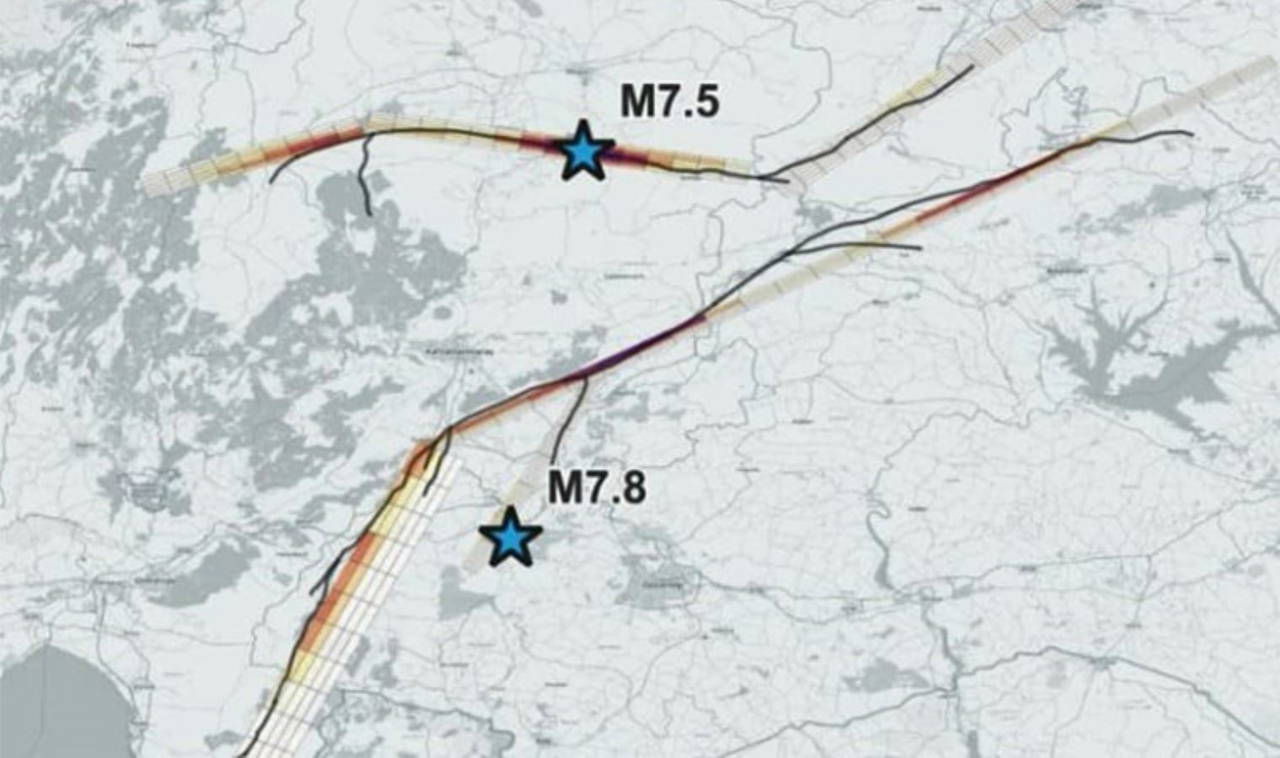 2002 yılından beri çizdiği haritadaki fayların yırtıldığını söyleyen Üşümezsoy, Pötürge'den Pazarcık ile Islahiye'ye uzanan hatta 7,8 ve Akçadağ'dan Elbistan'a uzanan hatta ise 7,5 şiddetinde deprem olacağını tahmin ettiği haritayı paylaştı.