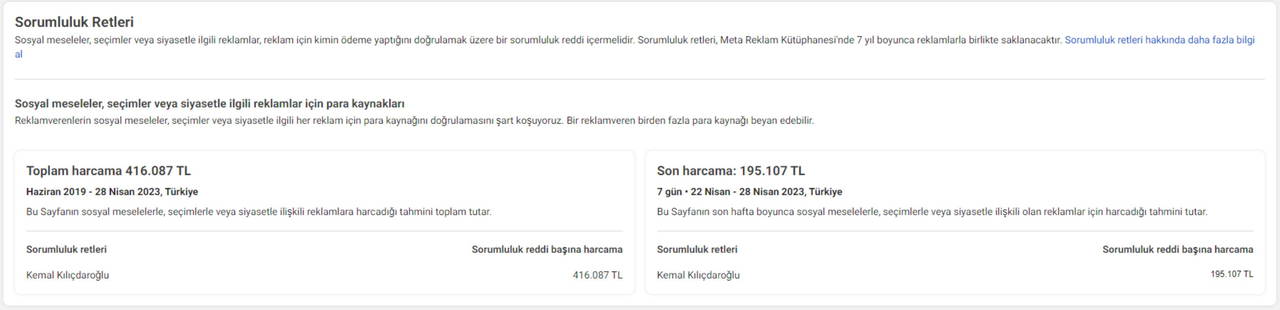Kemal Kılıçdaroğlu’nun reklam harcamaları sayfası incelendiğinde ise son olarak 22 Nisan ve 28 Nisan 2023 tarihleri arasında, sosyal meselelerle, seçimlerle veya siyasetle ilişkili olan reklamlar için harcadığı tahmini tutarın 195 bin 107 TL harcandığı görülüyor.