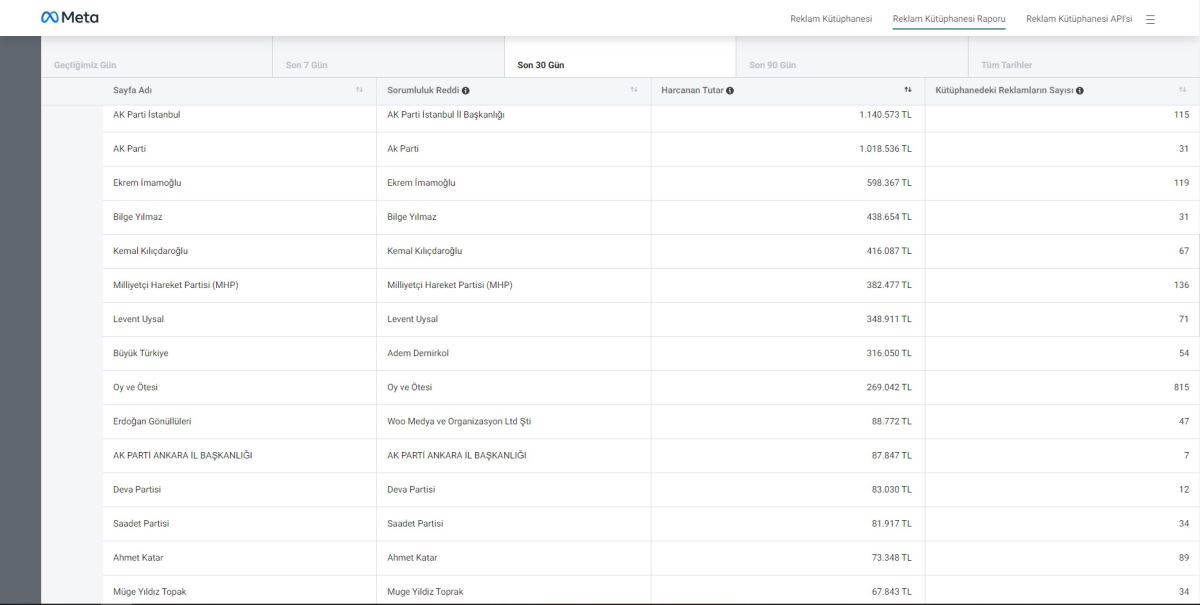 Listede Kılıçdaroğlu ise beşinci sırada. Kılıçdaroğlu’nun 26 Mart - 24 Nisan 2023 tarihleri arasında Facebook reklamları için 416 bin 87 TL harcadığı görülüyor. Kılıçdaroğlu’nun hesabından yapılan son 30 günlük harcama, 67 reklam için yapılmış.