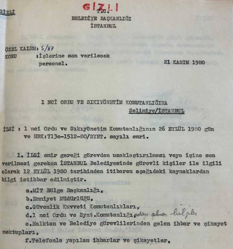 Atanmış belediye başkanı Akansel, 21 Kasım 1980 günü Sıkıyönetim Komutanlığı’na gönderdiği “Gizli” damgalı resmi belgede listenin nasıl hazırlandığına ilişkin şu bilgileri veriyor: “Emir gereği görevden uzaklaştırılması veya işine son verilmesi gereken İstanbul Belediyesi’nde görevli kişiler ile ilgili olarak 12 Eylül 1980 tarihinden itibaren aşağıdaki kaynaklardan bilgi istihbar edilmiştir.