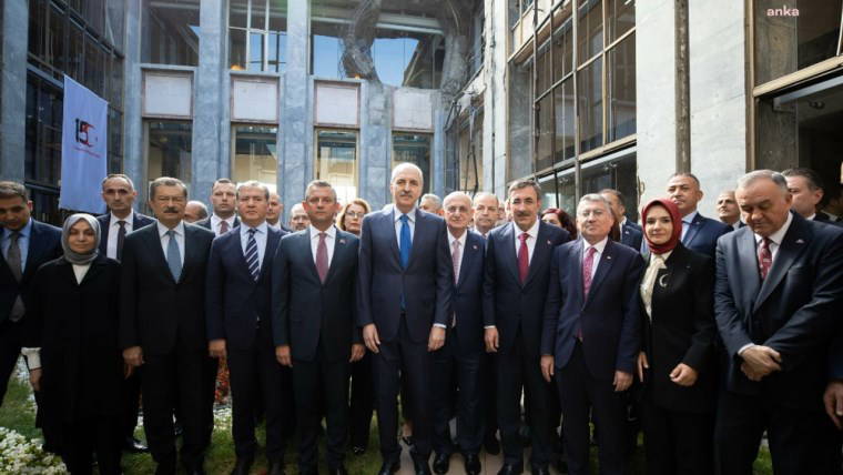 Cumhurbaşkanı Yardımcısı Cevdet Yılmaz, CHP Genel Başkanı Özgür Özel, CHP’li milletvekilleri, AKP Grup Başkanı Abdullah Güler, MHP Grup Başkanvekili Erkan Akçay, İYİ Parti Grup Başkanvekili Turhan Çömez ve kuvvet komutanlarının yer aldığı heyet, ikinci bombanın düştüğü Şeref Holü’nde anı fotoğrafı çekti.
