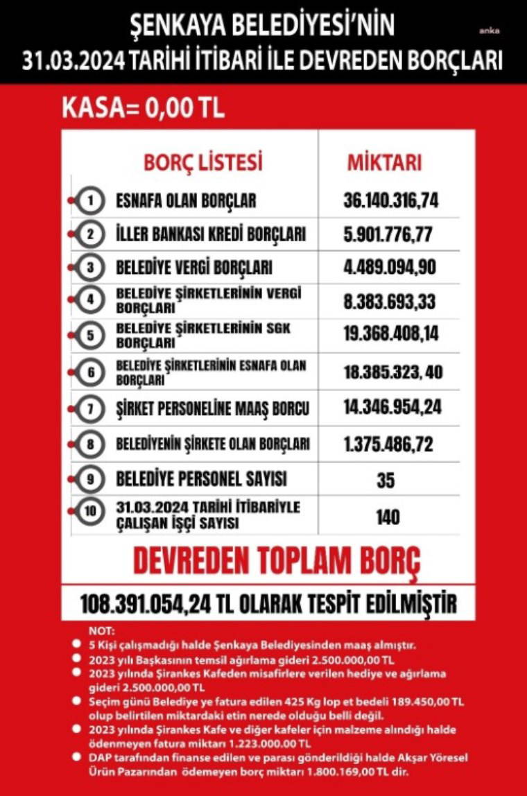 Mahmut Tanal, 31 Mart günü belediyeye fatura edilen 425 kilo lop etin bedelinin 189 bin 450 lira olduğunu, ancak belirtilen miktardaki etin nerede olduğunun tespit edilmediğini ifade etti. 2023 yılında belediye işletmesi Şirankes Kafe ve diğer kafeler için malzeme alındığı halde ödenmeyen fatura miktarını ise 1 milyon 223 bin lira olduğunu belirtti.