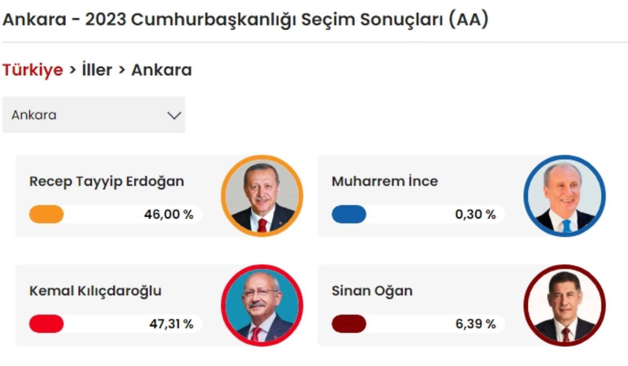 Seçim yasaklarının sona ermesiyle birlikte sandık verileri açıklandı. Sandıkların yüzde 100'ünün açıldığını bildiren Anadolu Ajansı'na göre, iktidar bloğunu oluşturan Cumhur İttifakı'nın adayı Recep Tayyip Erdoğan, başkentte Millet İttifakı'nın adayı Kemal Kılıçdaroğlu'nun gerisinde kaldı.