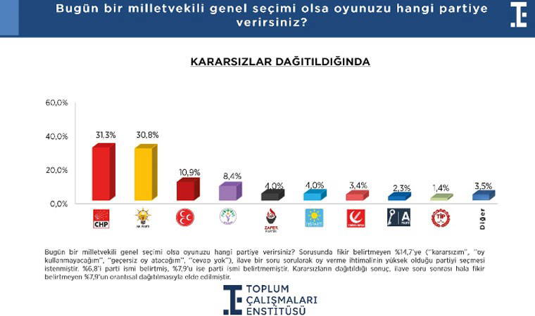 Enstitünün gerçekleştirdiği ankete göre, “Bugün bir milletvekili seçimi olsa oyunuzu hangi partiye verirsiniz?” sorusuna verilen yanıtlarda kararsızlar dağıtıldığında: