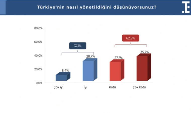 Anket sonuçlarına göre; katılımcıların yüzde 62’si ülkenin “çok kötü” veya “kötü” yönetildiğini düşünüyor. İyi yönetildiğini düşünenlerin oranı ise yalnızca yüzde 37,1.