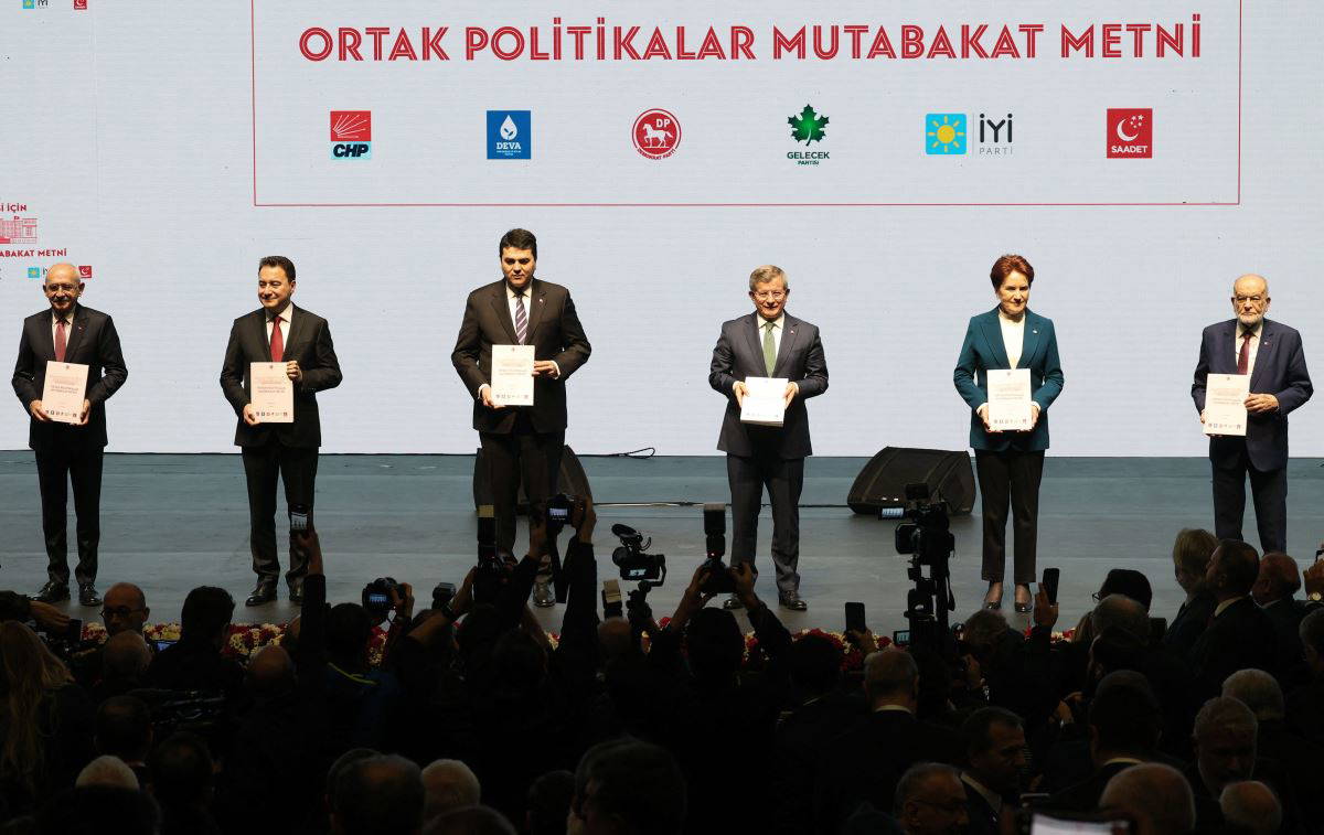 CHP Genel Başkanı Kemal Kılıçdaroğlu, İYİ Parti Genel Başkanı Meral Akşener, Saadet Partisi Genel Başkanı Temel Karamollaoğlu, DEVA Partisi Genel Başkanı Ali Babacan, Gelecek Partisi Genel Başkanı Ahmet Davutoğlu ve Demokrat Parti Genel Başkanı Gültekin Uysal salona alkışlarla geldi.