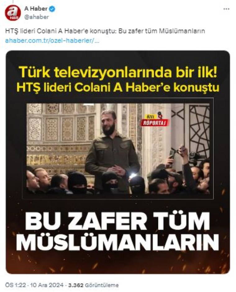 AKP'ye yakın Turkuvaz Medya bünyesindeki televizyon kanalı A Haber, terör örgütü HTŞ'nin lideri Ebu Muhammed Colani'yi ekranlarına taşıdı.