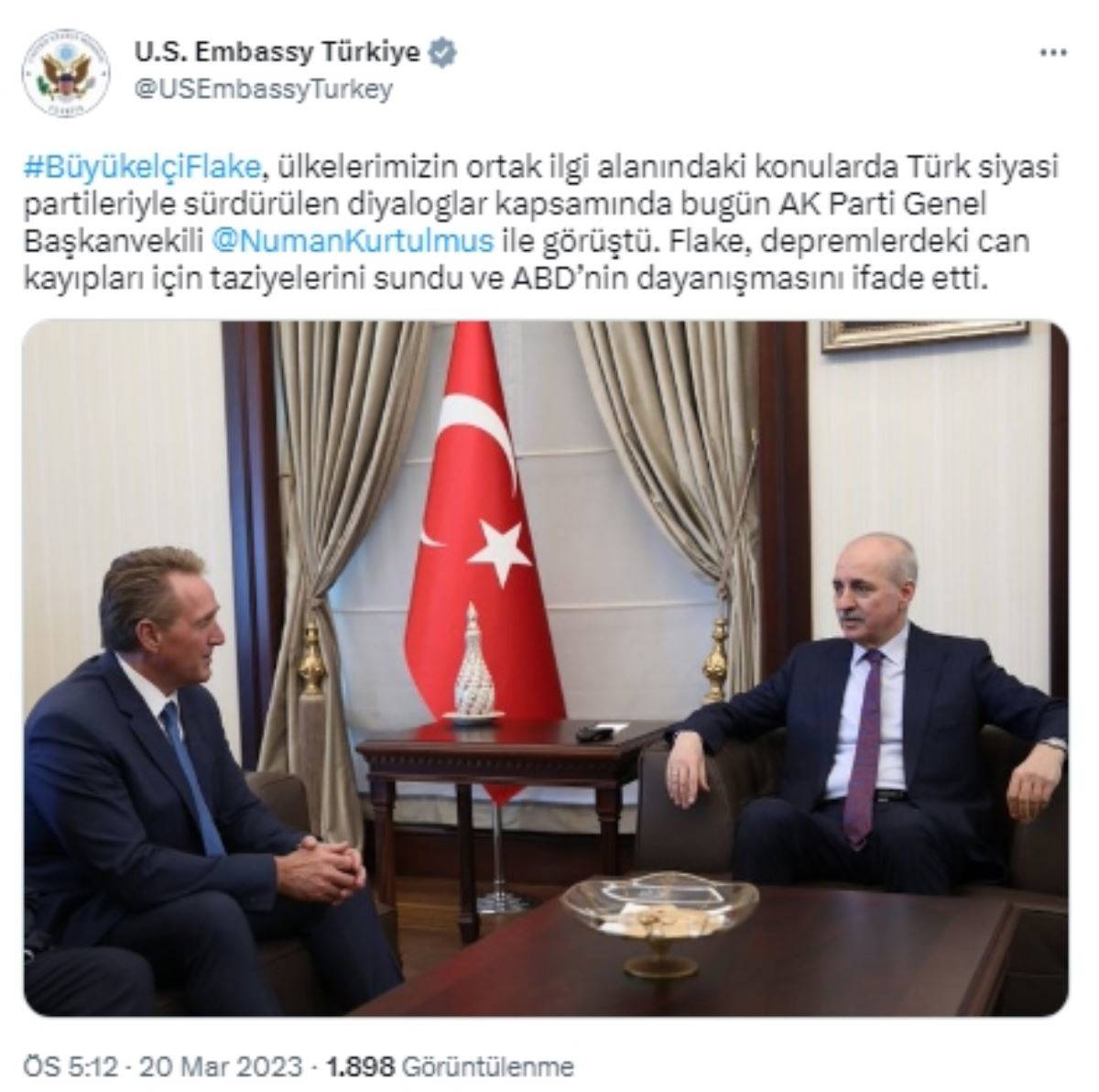 "Ülkelerimizin ortak ilgi alanındaki konularda Türk siyasi partileriyle sürdürülen diyaloglar kapsamında bugün AK Parti Genel Başkanvekili Numan Kurtulmuş ile görüştü. Flake, depremlerdeki can kayıpları için taziyelerini sundu ve ABD’nin dayanışmasını ifade etti."