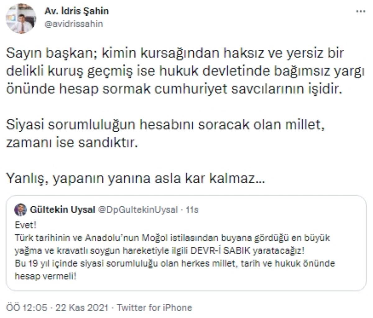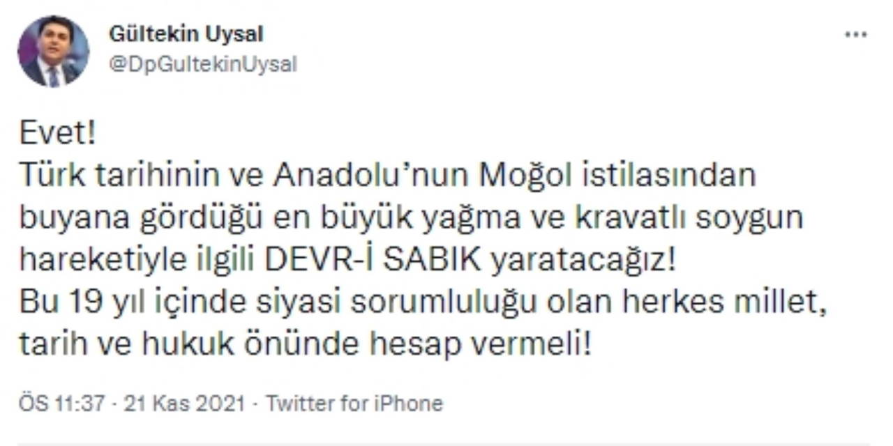 Uysal, Twitter üzerinden paylaştığı mesajında "Evet! Türk tarihinin ve Anadolu’nun Moğol istilasından bu yana gördüğü en büyük yağma ve kravatlı soygun hareketiyle ilgili devr-i sabık yaratacağız! Bu 19 yıl içinde siyasi sorumluluğu olan herkes millet, tarih ve hukuk önünde hesap vermeli!" ifadelerini kullandı.